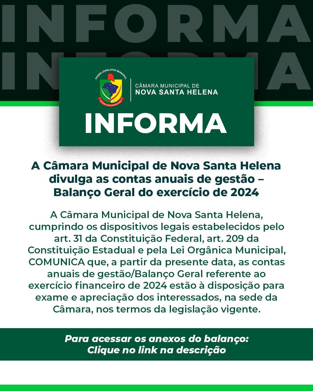 A Câmara Municipal de Nova Santa Helena - divulga as contas anuais da gestão - Balanço Geral do exercício de 2024