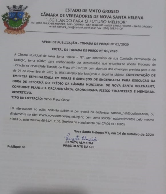 PUBLICAÇÃO: Aviso de tomada de preços 01/2020 na Câmara de Nova Santa Helena